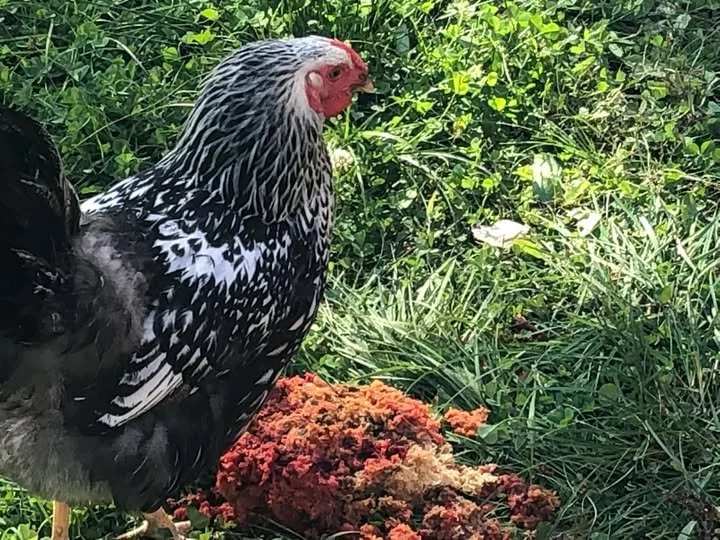 One of our silver-laced Wyandotte hens enjoying Booster Juice pulp
