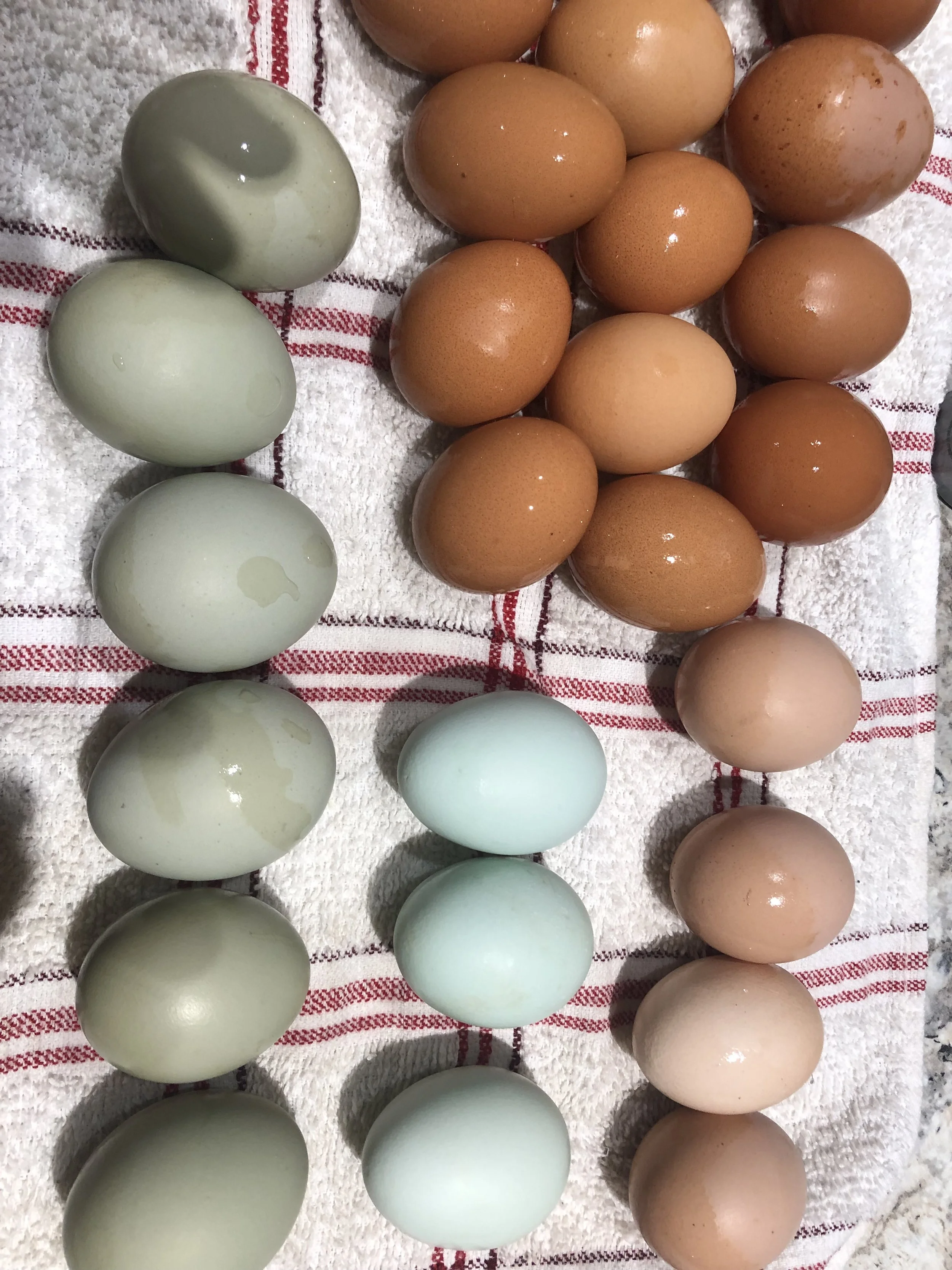 The pale peachy ones are from the Wyandottes, the brown ones from our Red Sex Linked, and the blue and green ones are from mixed hens (Easter Egger and Olive Egger crossed on Red Sex Linked?) that our friend Rowena bred for us.